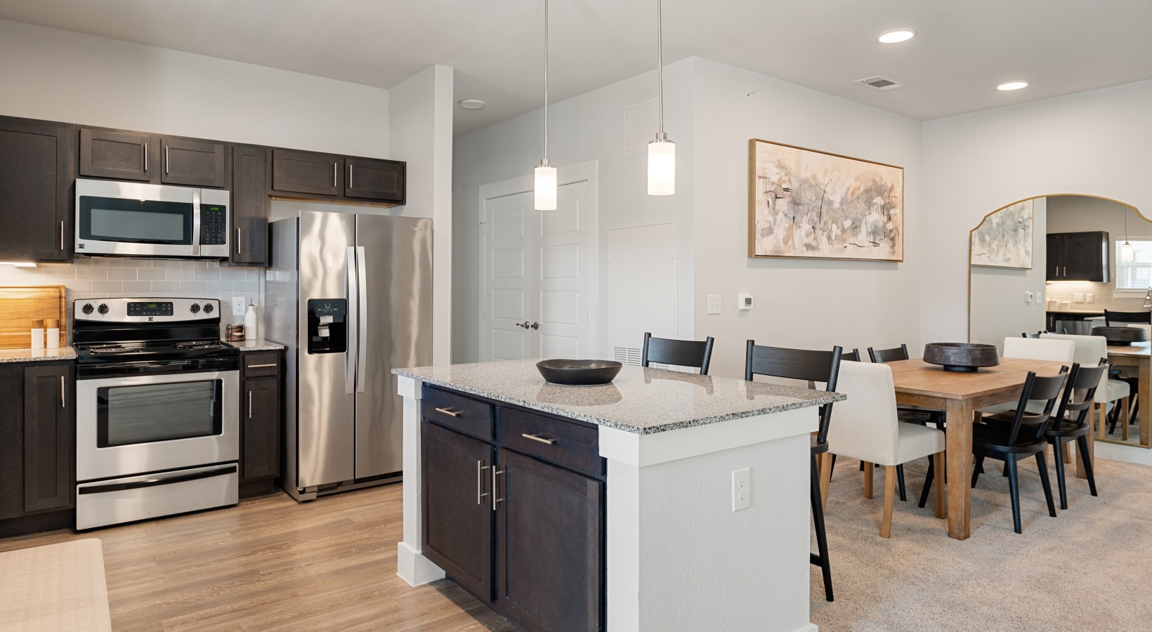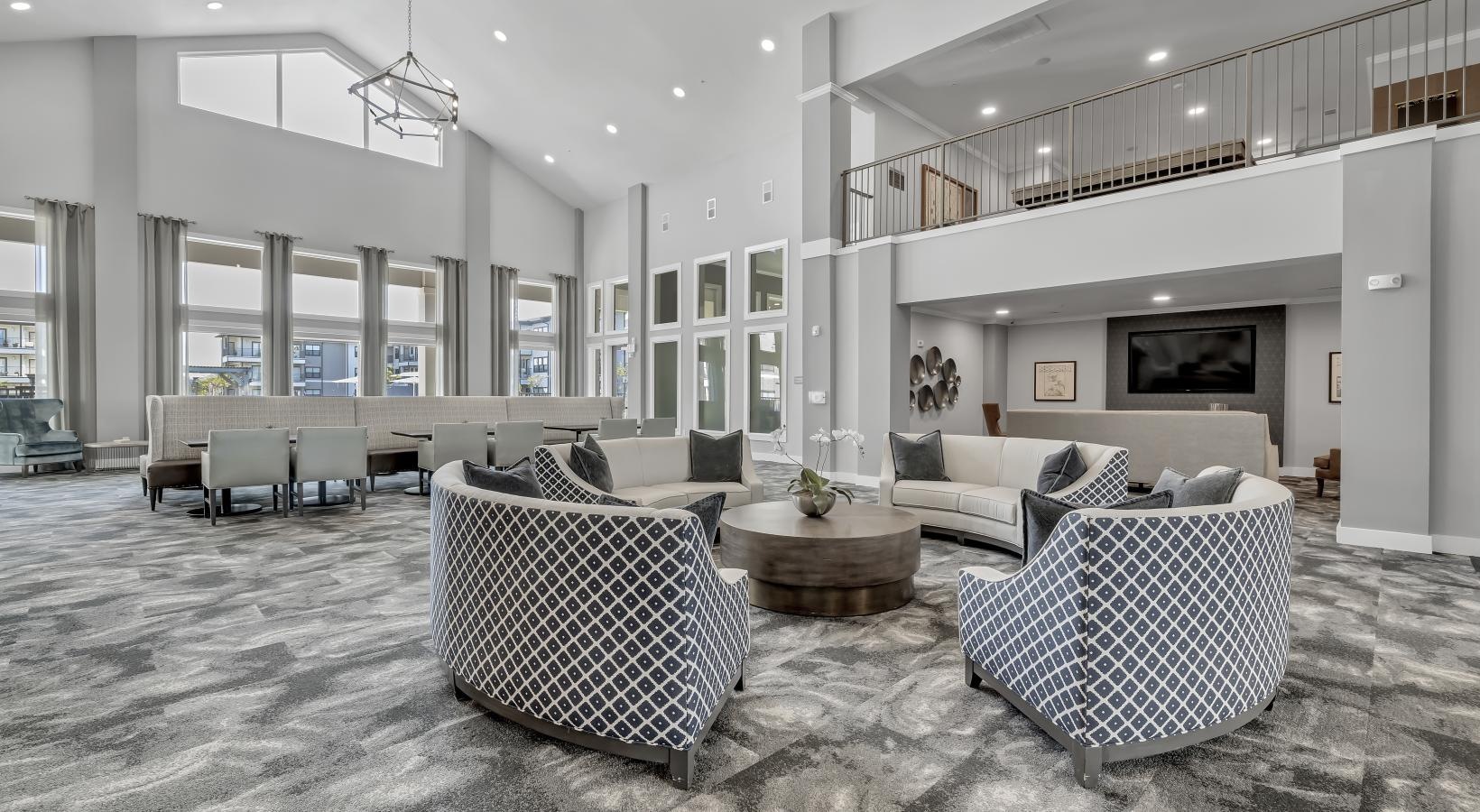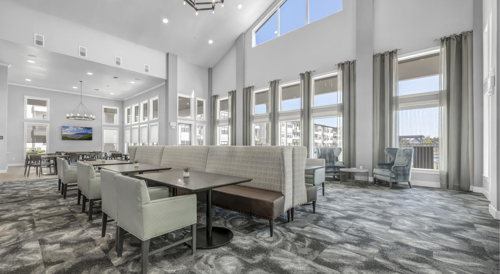 • a large room with a table and chairs