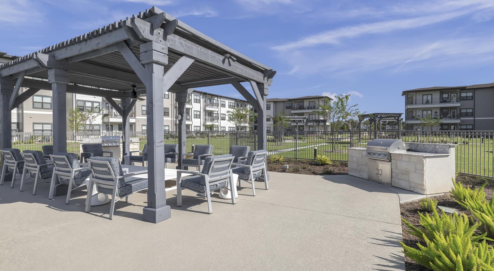 • a patio with chairs and a covered area with a fence and buildings in the background