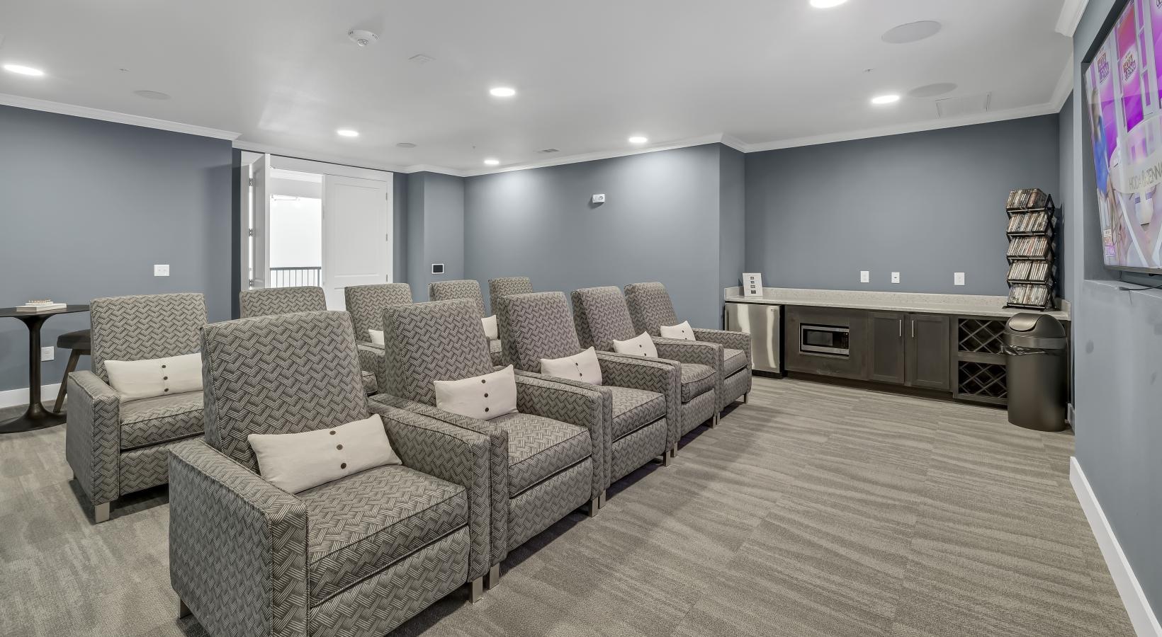 • a room with a couch and chairs and a tv screen