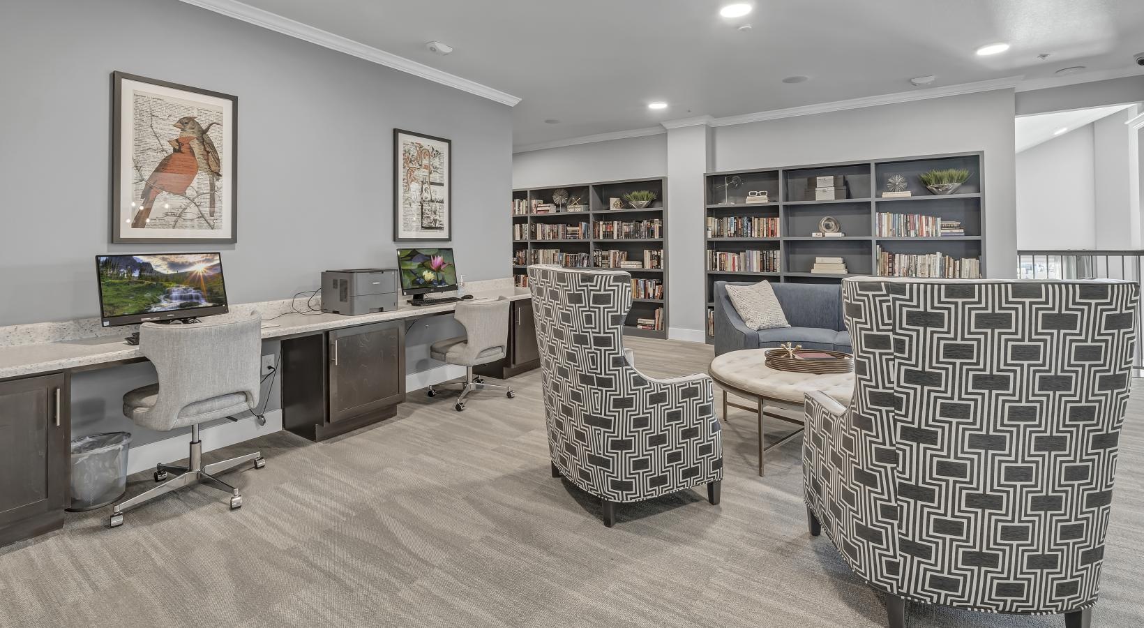 • a room with a table chairs and shelves with books on it